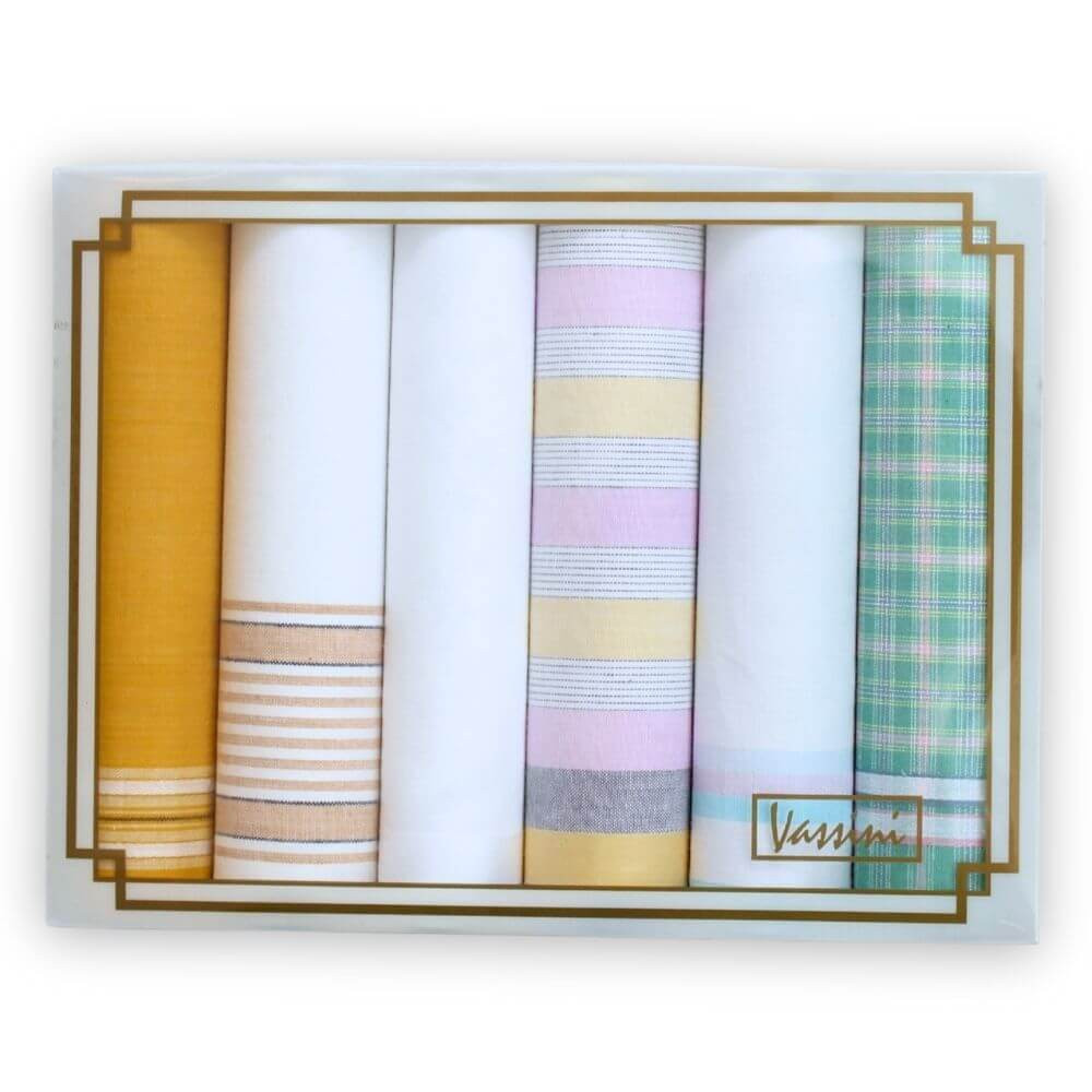 Sada dámských bavlněných kapesníčků působí velmi vkusně a něžně. Jsou uložené v praktickém boxu s průhledným plastovým víčkem. V každé krabičce je poskládáno 6 kusů látkových kapesníků v jemných pastelových barvách v odstínech oranžové a hnědé a bílé. Krabička/balení 6 kusů dámských látkových kapesníků z jemné čisté bavlny bude i vhodným a praktickým dárkem pro každou ženu.