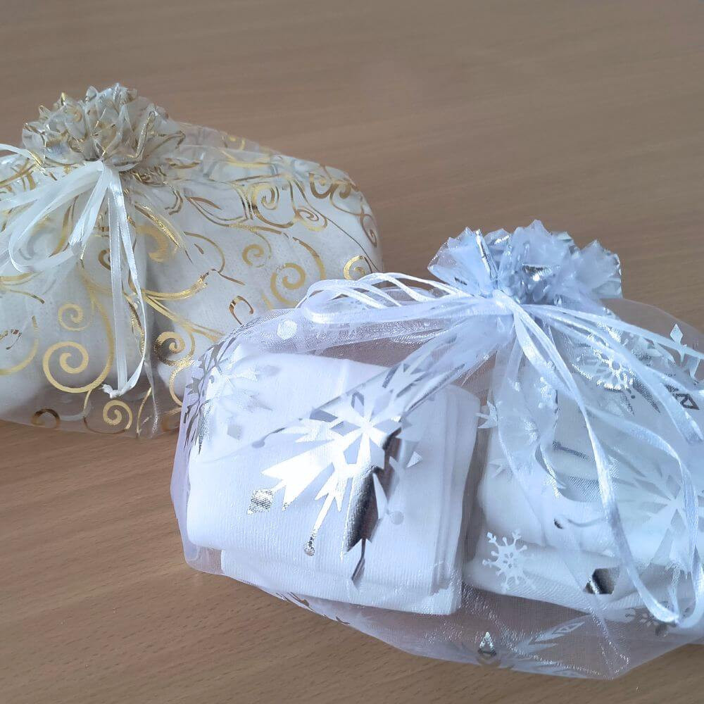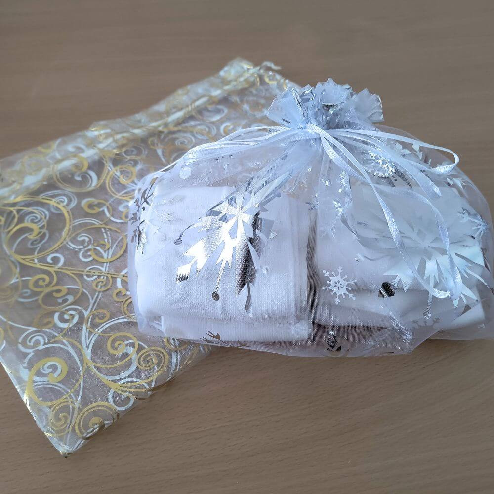 Ušetřete si práci s balením dárku a vložte ponožky nebo jiný dárek do dárkové taštičky z organzy a vytvořte krásné vánoční balení snadno a rychle. Praktický sáček o rozměrech 24 x 35 cm je ideální pro zabalení až 5 párů slabých ponožek. Zatahování přes delší stranu.
