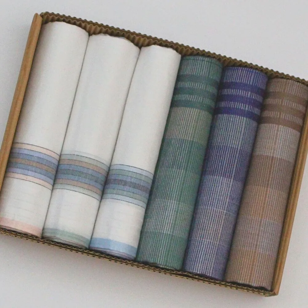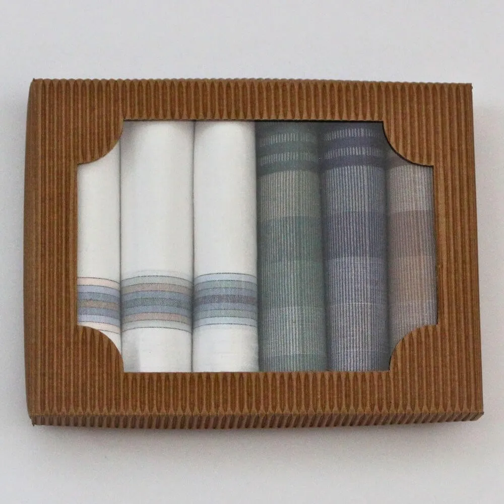 Bavlněné pánské kapesníky, ručně složené v praktické ekologické krabičce s průhledným víkem, jsou v sadě po šesti kusech.
