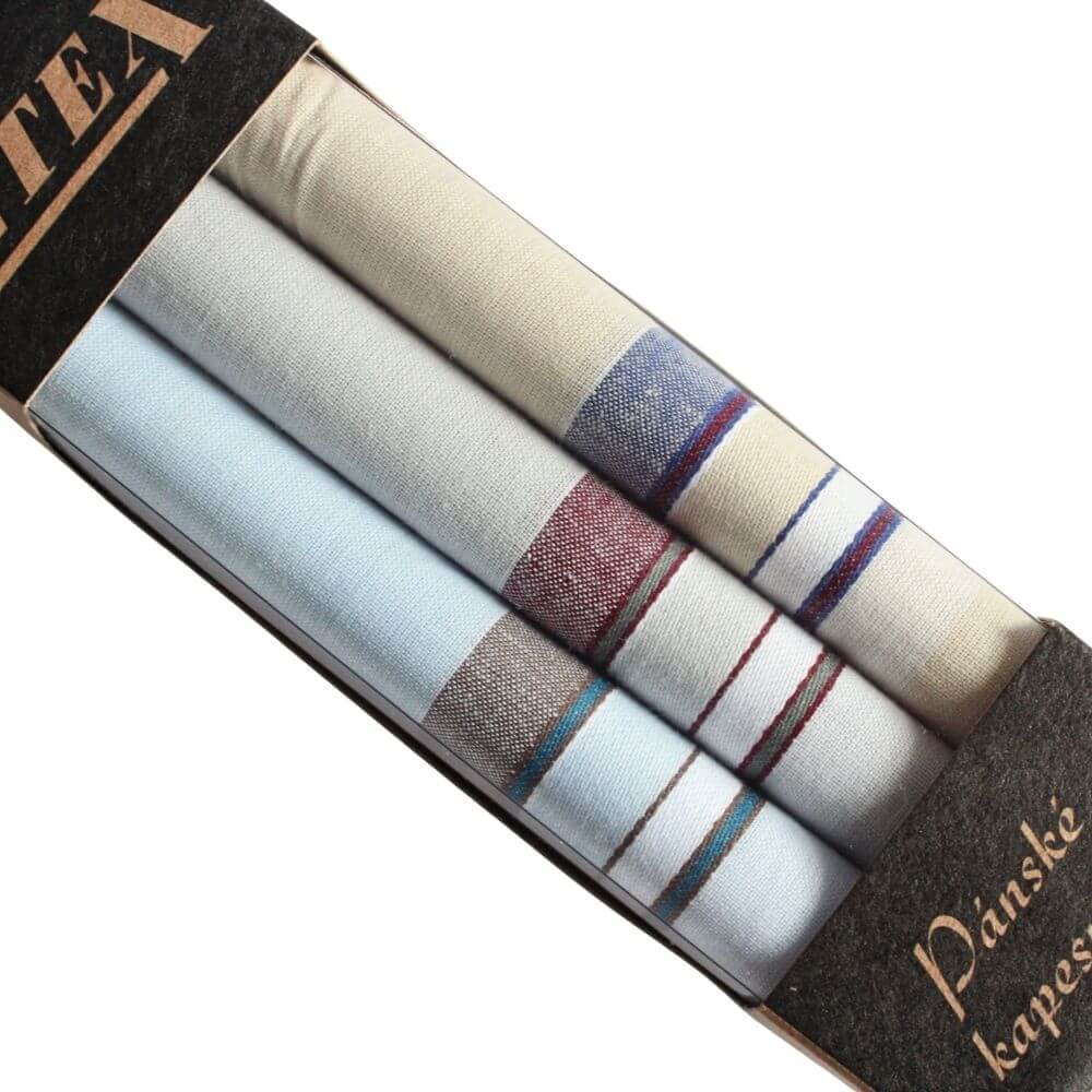 Oblíbené pánské látkové kapesníky jsou uloženy v útlé decentní krabičce s průhledem. Bavlněné kapesníky jsou ve výhodné sadě 2 dárkových krabiček po 3 kusech (celkem tedy 6 kusů) kapesníků ve světlých a tmavých odstínech vynikají vysokou kvalitou a tradičním zpracováním. 100% bavlněné měkké kapesníky ocení a upotřebí každý muž a je jedno, zda tráví den v kanceláři, za volantem nebo třeba v ordinaci či na stavbě.