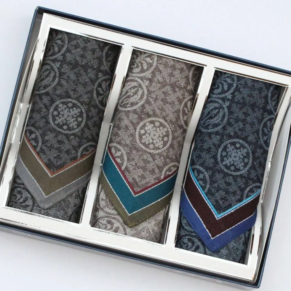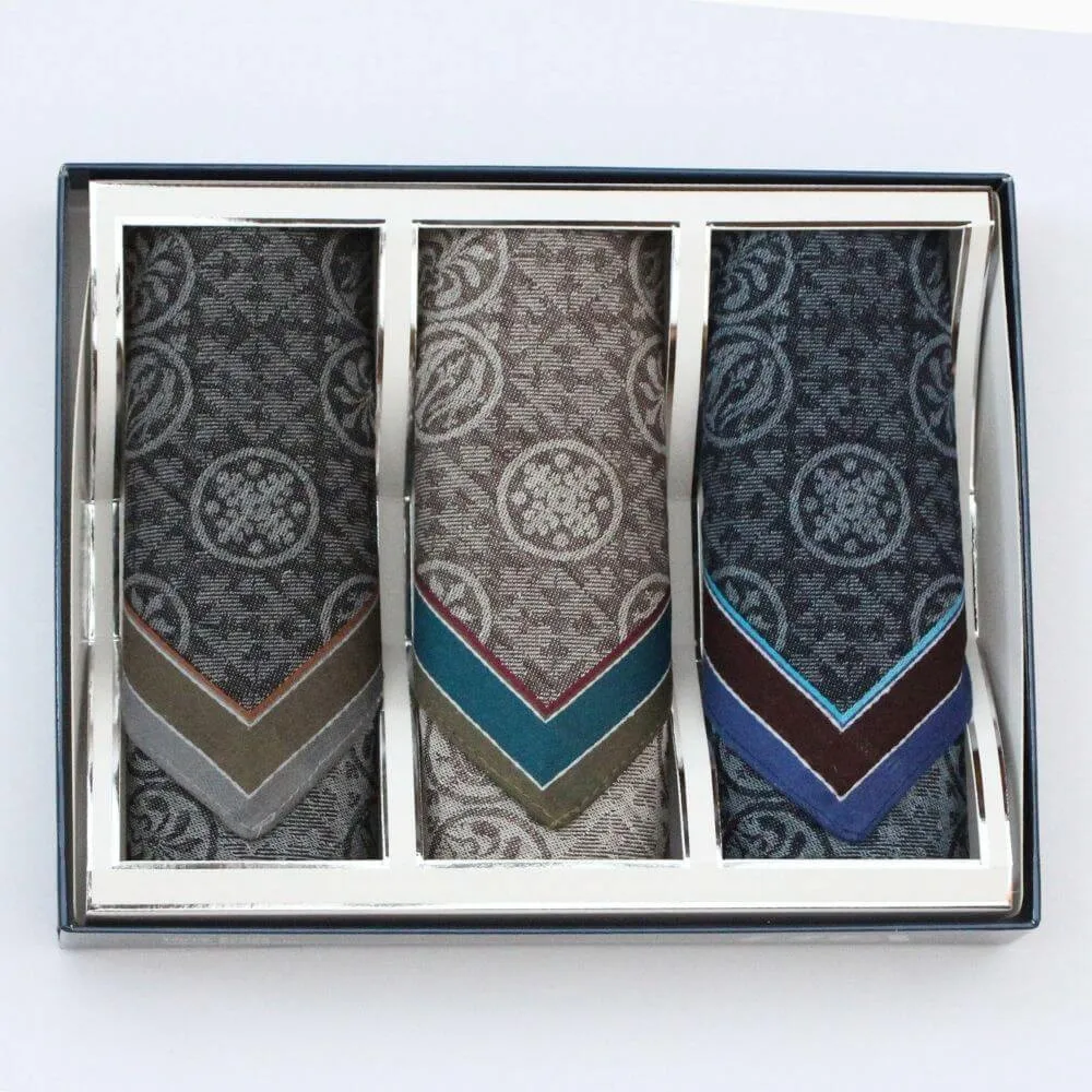 Sada obsahuje 3 vytkávané kapesníky v tmavých barvách - šedá, hnědá a modrá s efektním vzorem a barevným pruhem po obvodu.