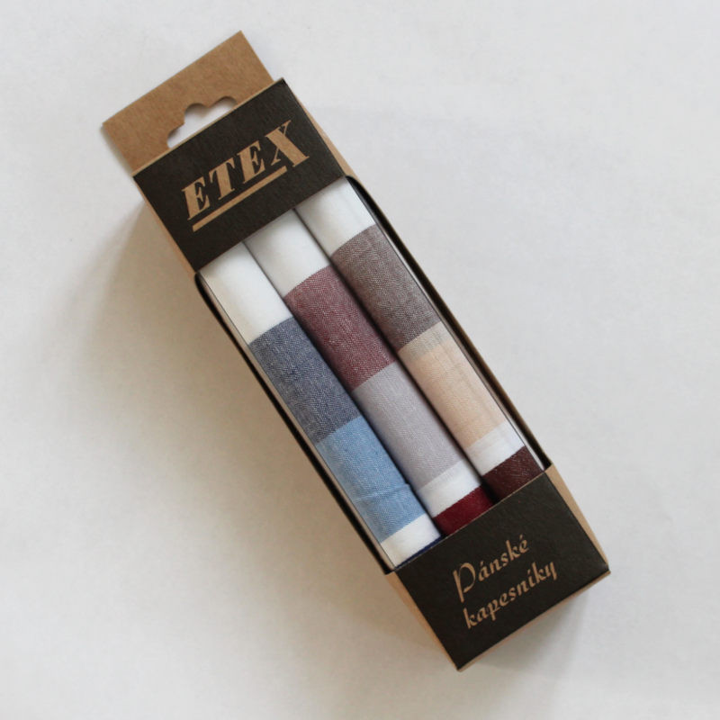 Praktická sada 3 kusů oblíbených pánských látkových kapesníků je uložena v útlé decentní průhledné krabičce. Kvalitní látkové kapesníky jsou vyrobené v České republice.