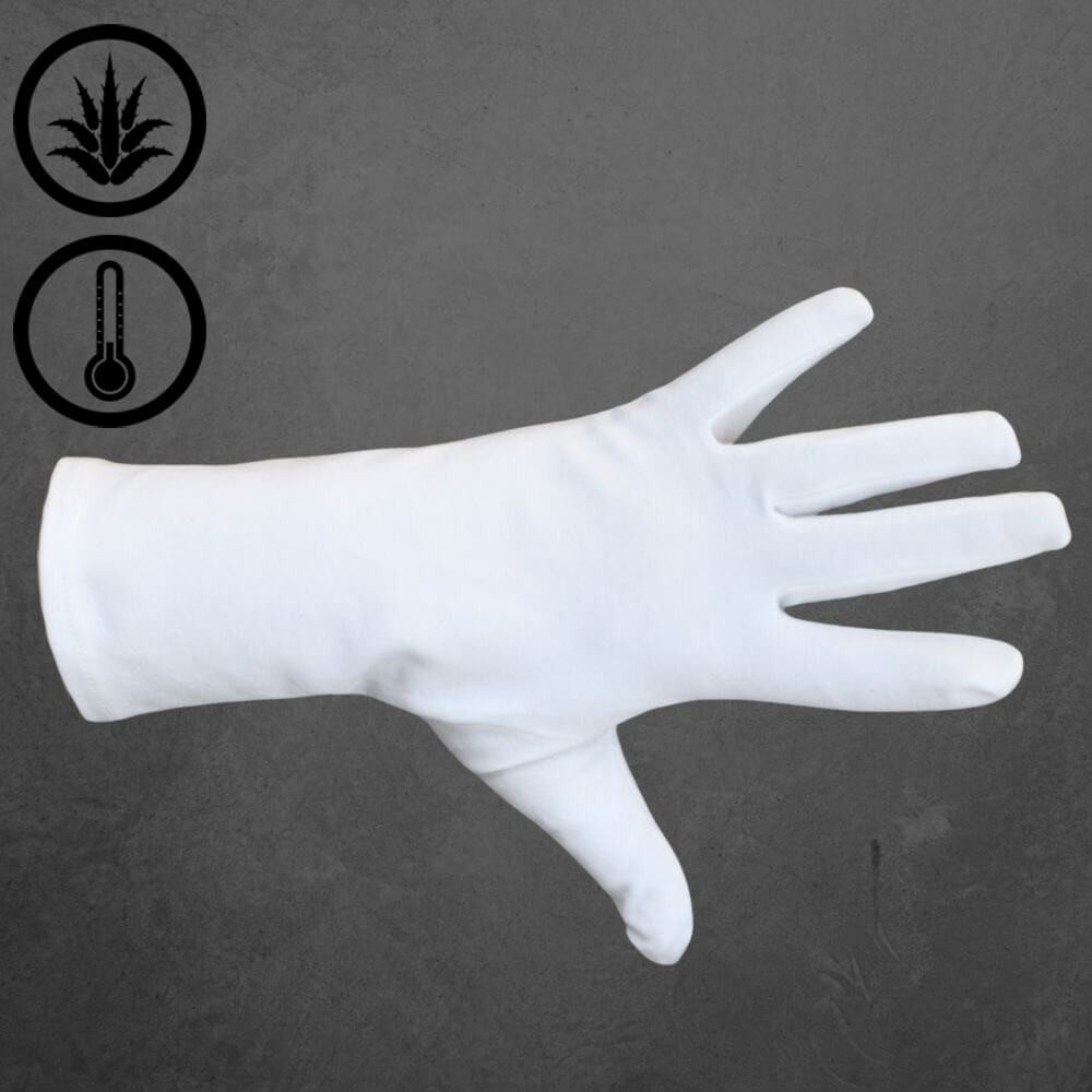 Pánské bavlněné rukavice s úpravou Aloe Vera přispívají k regeneraci namáhané pokožky rukou a jsou vhodné i pro všechny, kdo trpí na ekzémy a suchou pokožku. Pečující úprava na bázi gelu podporuje hydrataci pokožky a pomáhá udržet přirozené mikroklima kolem rukou. Díky svým vlastnostem pokožku nejen pomáhá zvláčnit a omezit její vysušování, přináší také příjemný zklidňující chladivý pocit. Pro ještě lepší efekt doporučujeme nosit rukavice na noc po aplikaci hydratačního krému.