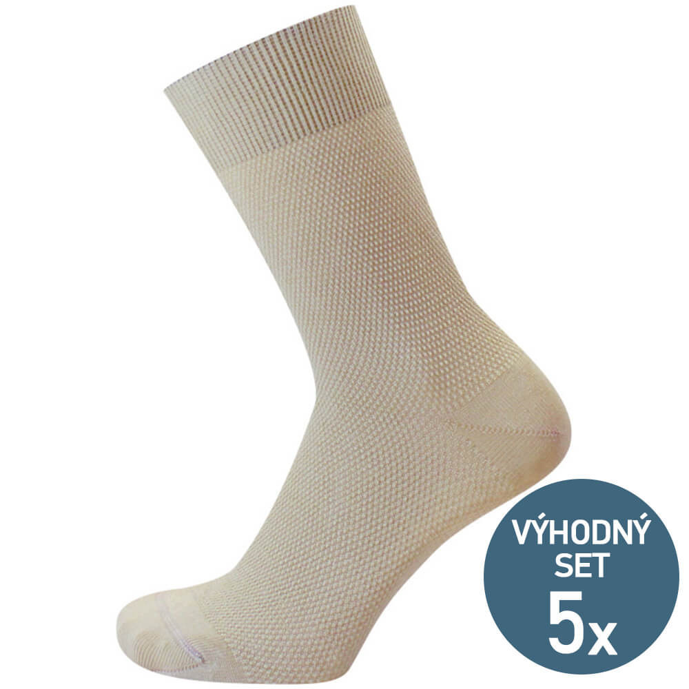 Luxusní ponožky ve výhodném balení 5 párů se slevou 25 %! Ponožky mají elegantní vzorek jemné pecičky a jsou vyrobeny z velmi kvalitní mercerované bavlny. Kombinace bavlny s Lycrou drží ponožku příjemně na nohou, pletenina je přitom velmi elastická a nesvírá. Ponožky jsou velmi komfortní na nošení.