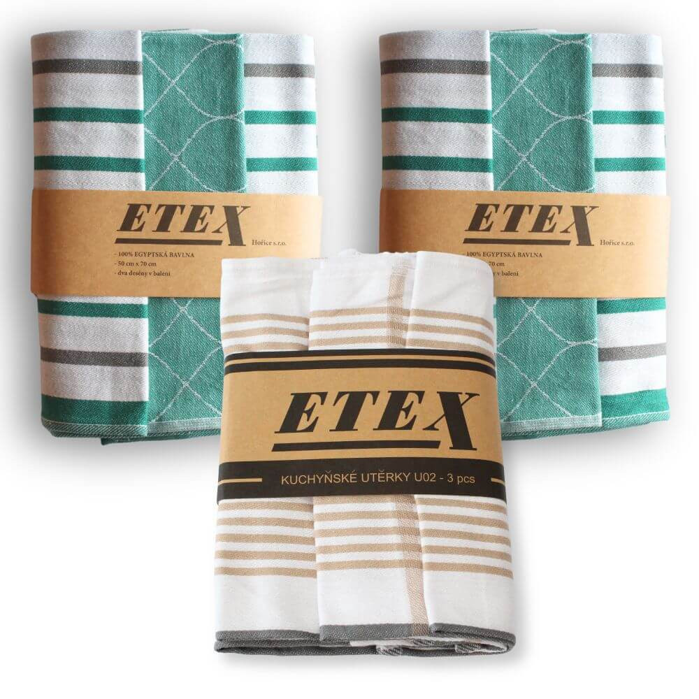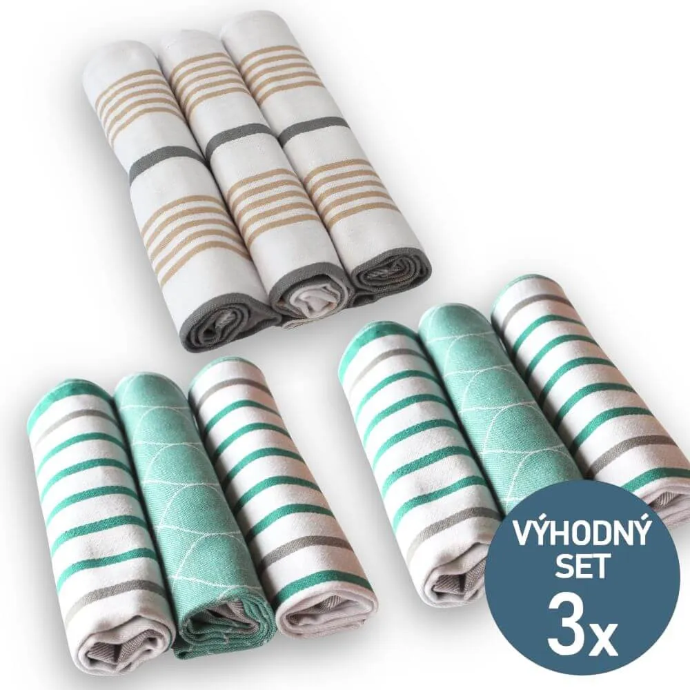 Výhodná sada utěrek obsahuje kombinaci 3 setů v kombinaci - 2x zelené a 1x proužky.